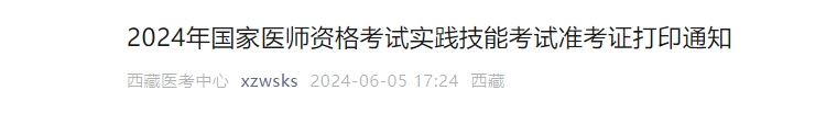西藏2024年国家医师资格实践技能考试准考证打印通知