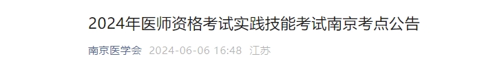 江苏南京市医师资格考试领导小组办公室发布关于2024年医师资格考试实践技能考试南京考点公告,考试时间为6月15日-22日,技能准考证打印时间为考前7日。通知详情如下: