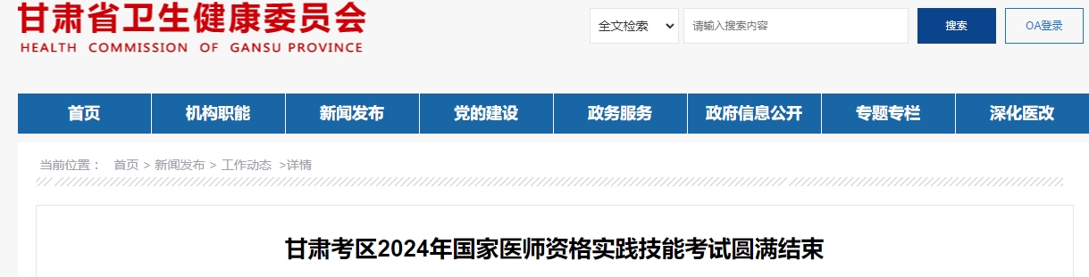 甘肃省卫生健康委员会发布关于甘肃考区2024年国家医师资格实践技能考试圆满结束的通知,实践技能考试成绩查询时间为6月28日起,通知详情如下: