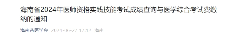 海南省2024年医师资格医学综合考试费缴纳的通知