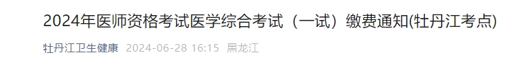 牡丹江考点2024年医师资格医学综合考试(一试)缴费通知