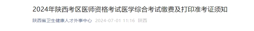 陕西省卫生健康人才外事中心发布关于2024年陕西考区医师资格考试医学综合考试缴费及打印准考证须知,医学综合考试网上缴费时间为7月5日-7月19日,通知详情如下: