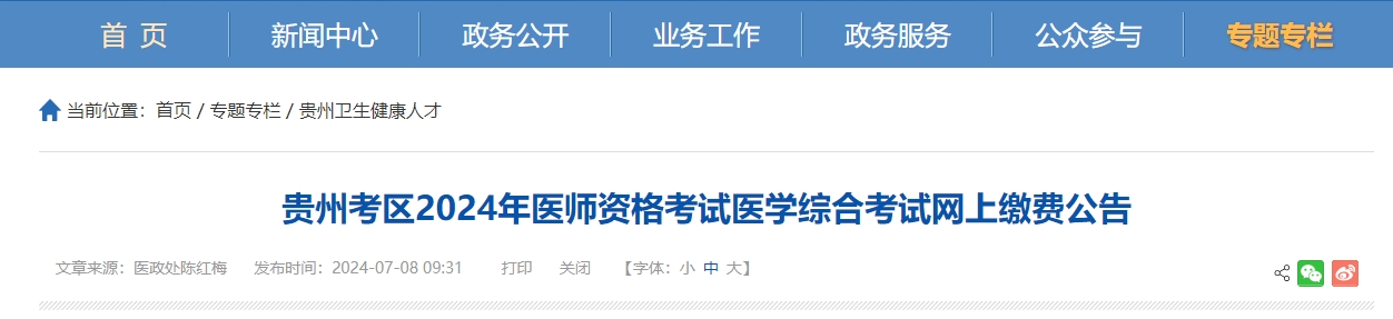 贵州省卫生健康委员会发布关于贵州考区2024年医师资格考试医学综合考试网上缴费公告,医学综合考试缴费时间为7月8日至7月22日,通知详情如下: