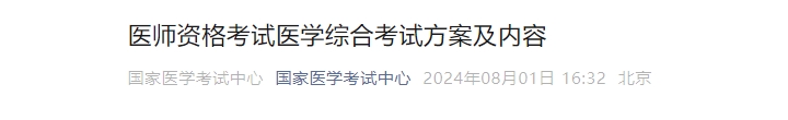 【考试内容】2024年医师资格医学综合考试方案及内容 发布时间:2024-08-01 16:55:28 国家医学考试中心发布关于医师资格考试医学综合考试方案及内容,详情如下: 相关通知: 【考试时间】2024年医师资格医学综合考试将于8月16日至18日举行 【考试规则】2024年医师资格计算机化考试规则 【考区联系方式】医师资格考试全国各考区考点咨询电话 【合格分数线】2024年医师资格医学综合考试合格分数线