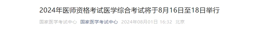 【考试时间】2024年医师资格医学综合考试将于8月16日至18日举行