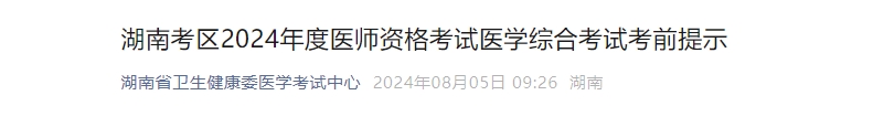 湖南省卫生健康委医学考试中心发布关于湖南考区2024年度医师资格考试医学综合考试考前提示,医学综合考试准考证打印功能将于2024年8月8日12:00开通。通知详情如下: