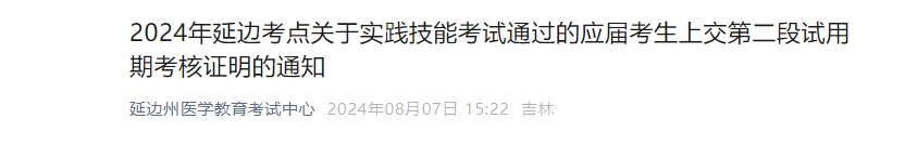 吉林省延边州医学教育考试服务中心发布了《2024年延边考点关于实践技能考试通过的应届考生上交第二段试用期考核证明的通知》,据通知可知,2024年医考实践技能考试通过的应届考生(毕业时间为2024年6月或7月),请在2024年8月8日-8月13日(周六、周日休息),上交第二段《试用期考核证明》。通知详情如下: