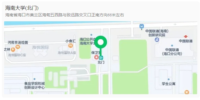 海南大学海甸校区北门(海口市美兰区海甸五西路,北门步行至考场大约需要10分钟,请考生提前安排时间。)