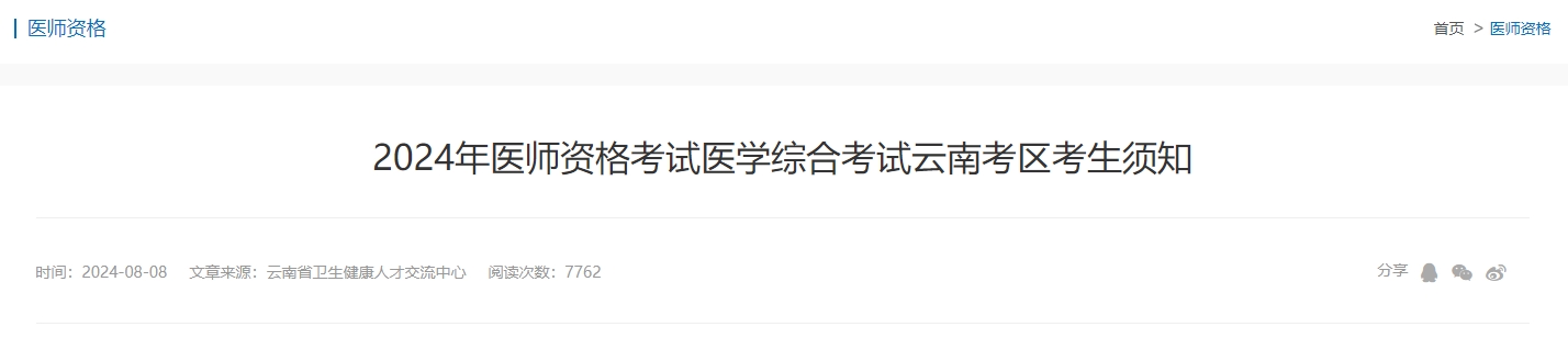 云南省医师资格考试考区办公室发布关于2024年医师资格考试医学综合考试云南考区考生须知,云南省医学综合考试准考证打印时间为2024年8月9日起,通知详情如下: