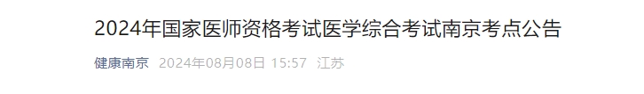 江苏南京市医师资格考试领导小组办公室发布关于2024年国家医师资格考试医学综合考试南京考点公告,医学综合考试定于8月16日至18日举行,8月9日开放准考证打印功能,通知详情如下: