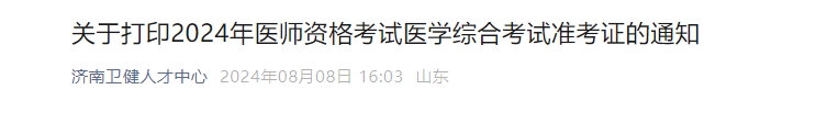 国家医师考试山东考区济南考点办公室发布关于打印2024年医师资格考试医学综合考试准考证的通知,医学综合考试准考证于8月9日09:00起开放打印,通知详情如下: