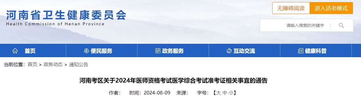 河南省卫生健康委员会发布河南考区关于2024年医师资格考试医学综合考试准考证相关事宜的通告,河南考区将于2024年8月12日开通医学综合考试准考证打印功能。通知详情如下: