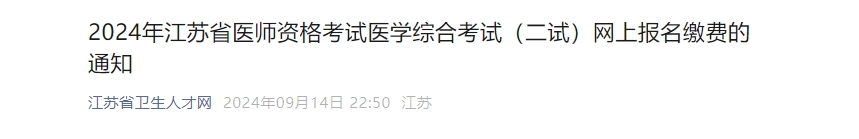 江苏省2024年医师资格医学综合考试(二试)网上报名缴费通知