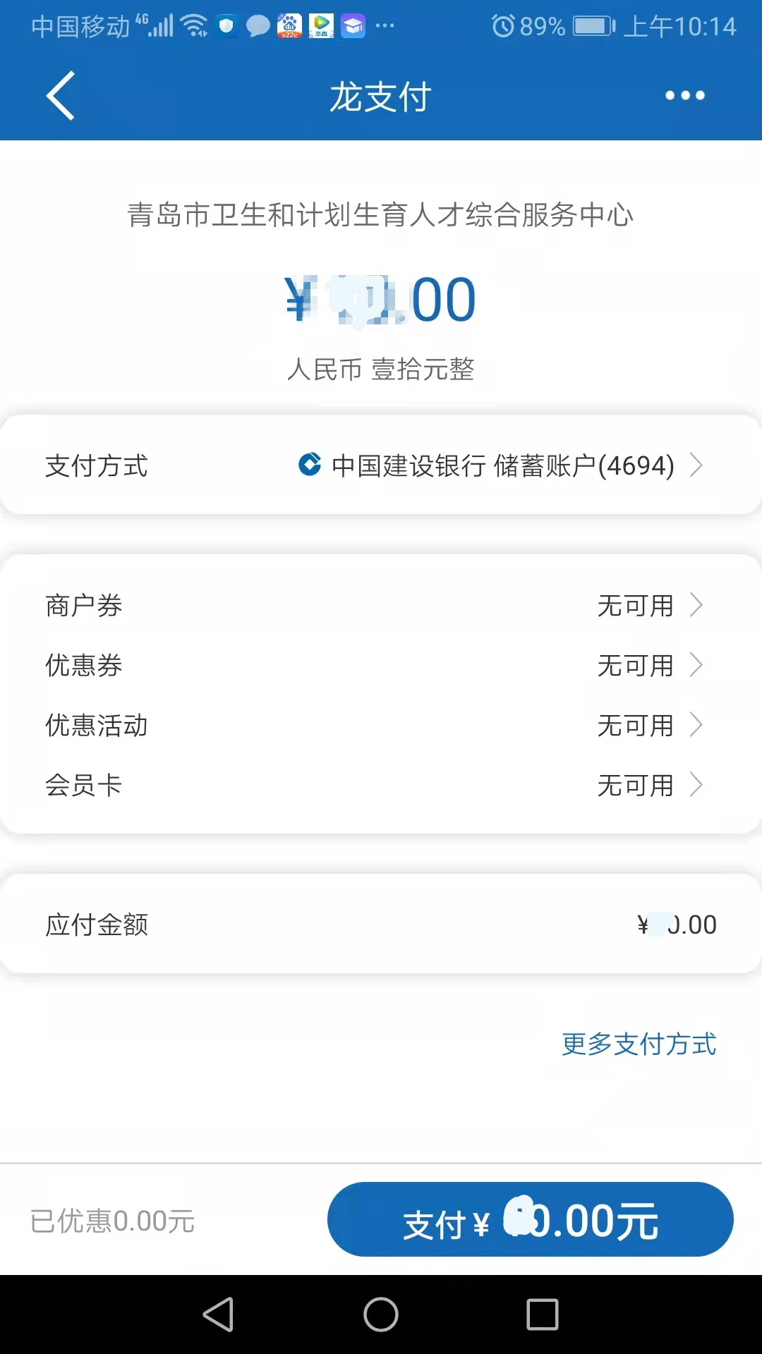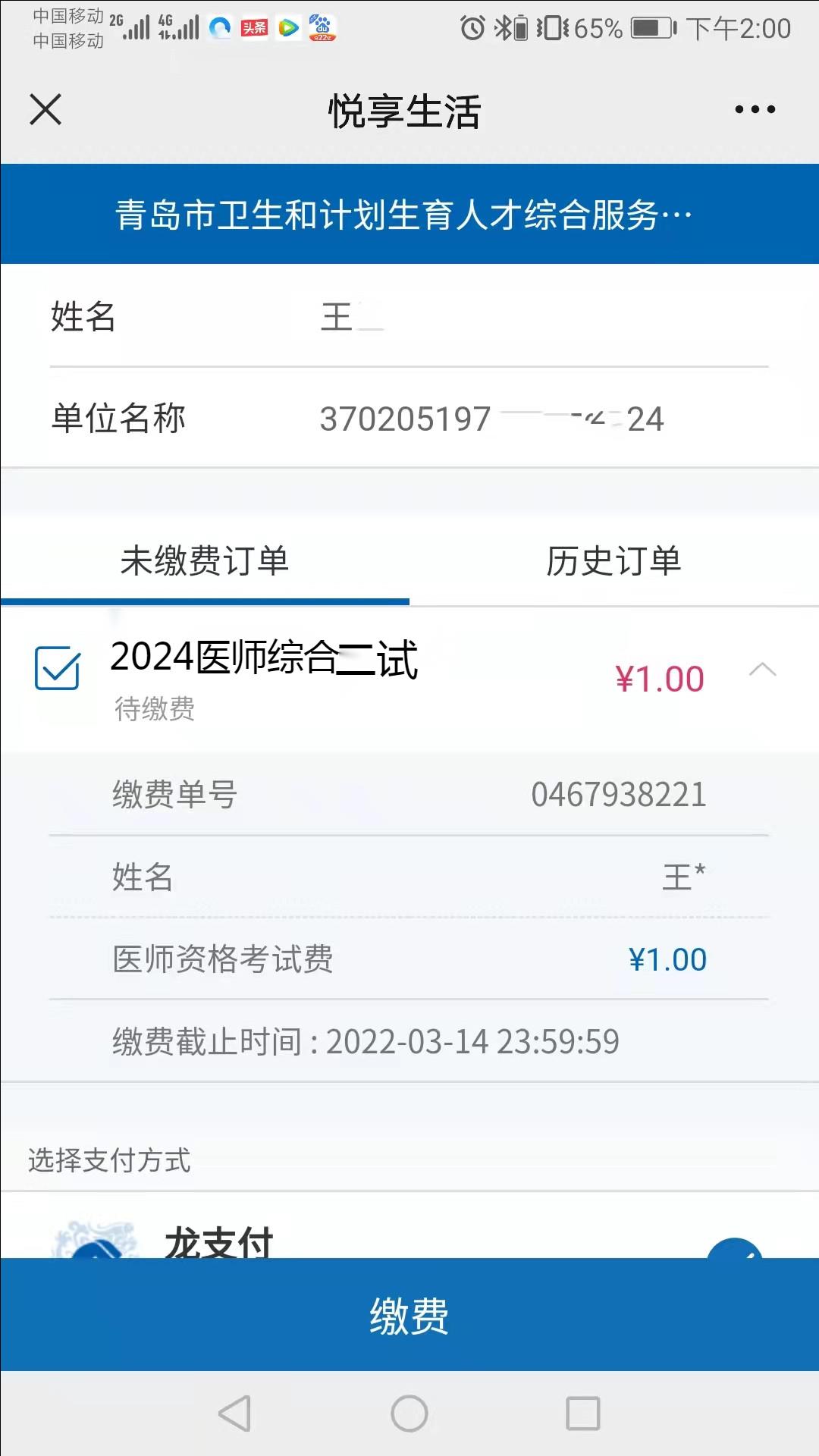 查询缴费单时,单位名称栏目请填“证件号码”,以居民身份证报考的考生请填写身份证号,以其他证件报考的考生请填写报考时所提交的相应证件的号码。青岛考点考生缴费成功后可在建设银行“云平台”查到缴费记录,国家医学考试网不提供缴费查询服务。