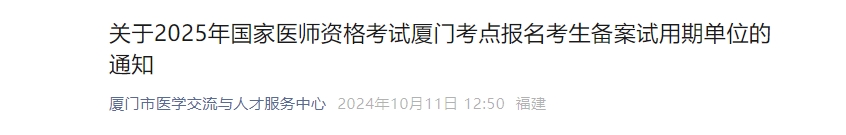 为做好2025年国家医师资格考试厦门考点报名工作,拟开展报名考生试用期单位备案工作,具体通知如下: