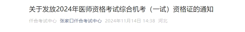 河北省张家口仟合考试中心关于发放2024年医师资格考试综合机考(一试)资格证的通知,通知详情如下:
