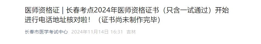 吉林省长春市医学考试中心发布关于长春考点2024年医师资格证书(只含一试通过)开始进行电话地址核对啦!(证书尚未制作完毕),通知详情如下: