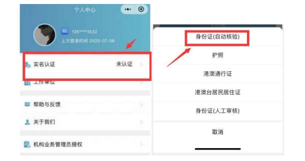个人中心的实名认证菜单都可以进行实名认证操作,优先选择“身份证(自动核验)”方法。系统自动核验,考生按照系统提示要求,上传身份证件照片,系统自动识别、即 可完成实名认证。