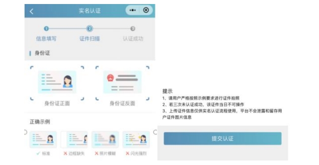 (1)选择身份证后需要进行证件扫描,请严格按照示例进行操作,如果扫描次数过多我们会提示进行人工审核流程