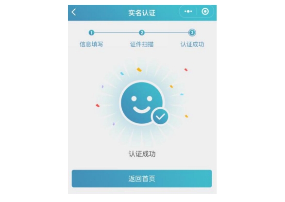 完成信息填写、证件扫描提交后完成认证,显示“认证成功”。
