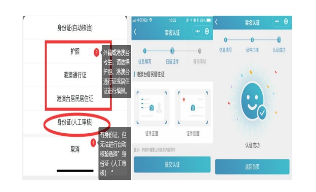 “身份证(自动核验)”多次失败,无法完成实名认证,可选择“身份证(人工审核)”进行人工审核;港澳台或外籍考生无法进行身份证(自动核验),请选择其他证件类型进行认证。(请港澳台或外籍考生,选择与国网报名相同证件类型及证件号码进行注册。),然后同样进行“信息填写”—“扫描证件”—“认证成功”流程。
