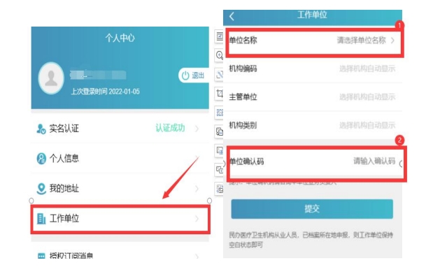 (一)实名认证完成后,需要绑定个人的工作单位,点击“工作单位”进行单位确认。在“单位名称”处搜索单位名称,点击正确单位名称,填写单位确认码即完成工作单位认证;