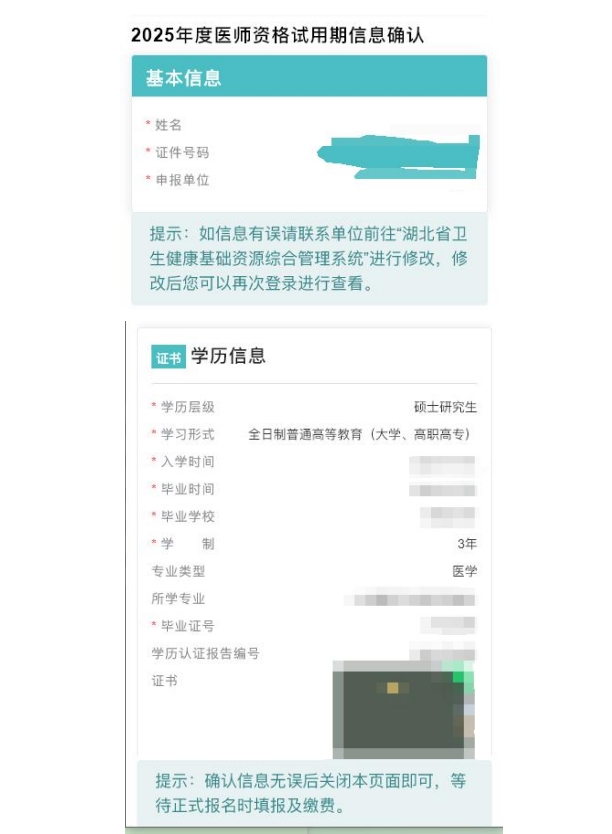 单位填写考生信息后,考生登录信息确认页面可以核对自己的信息,如果信息无误则安全退出等待正式报名即可;如信息有误请联系单位前往“湖北省卫生健康基础资源综合管理系统”进行信息的修改和补充,单位完成修改后,考生再次登录页面进行确认。