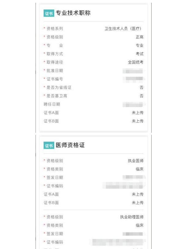 确认信息内容包括:基本信息、学历信息、医师资格证、医师执业证以及试用期填报(只需试用期人员填写)及附件图片(其中标红为必填项)。