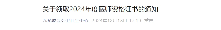 重庆九龙坡区关于领取2024年度医师资格证书的通知