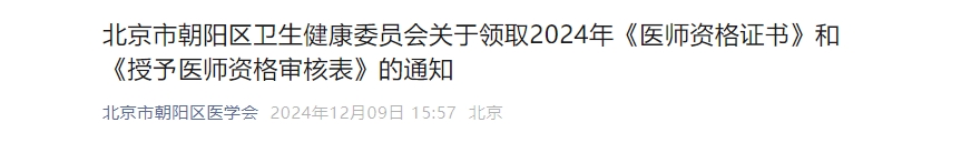 北京市朝阳区卫生健康委员会关于领取2024年《医师资格证书》和《授予医师资格审核表》的通知,领取时间2024年12月10日至12月31日,通知详情如下: