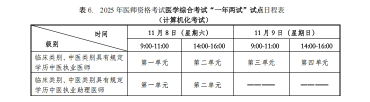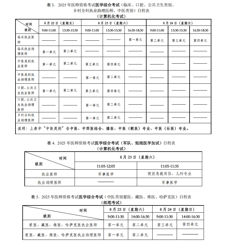 2025年医师资格考试实践技能考试时间为6月14日至25日,医学综合考试(计算机化考试)时间为8月22日至24日,每单元时长2小时。医学综合考试(纸笔考试)时间为8月23日至24日,每单元时长2.5小时。2025年医师资格考试医学综合考试“一年两试”试点(计算机化考试)时间为11月8日至9日,每单元时长2小时。