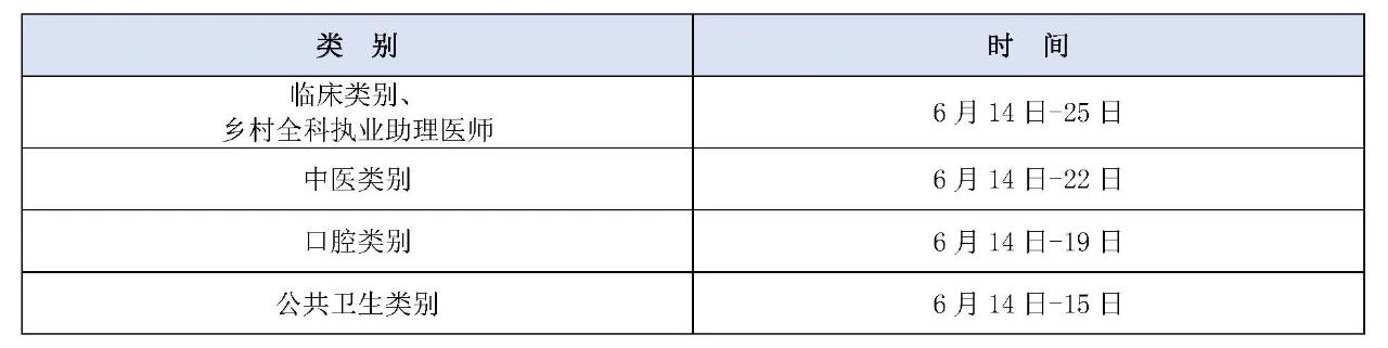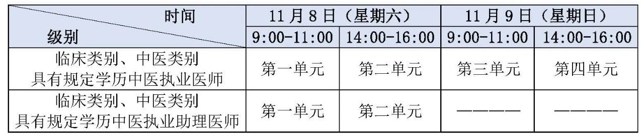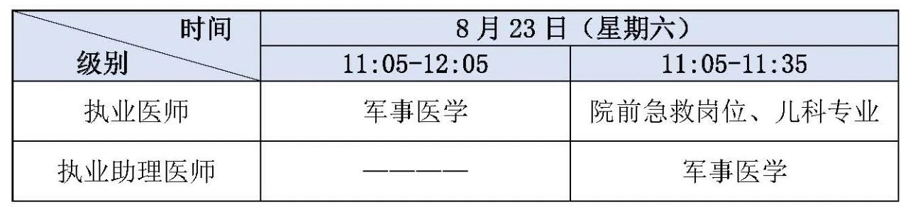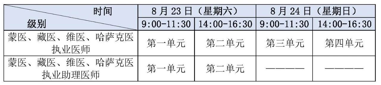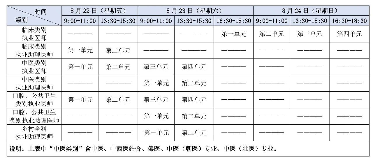考试实行计算机化考试,军队现役人员加试军事医学、院前急救岗位和儿科专业加试相应内容。中医类别蒙医、藏医、维医、哈萨克医专业实行纸笔考试。统一考试时间如下: