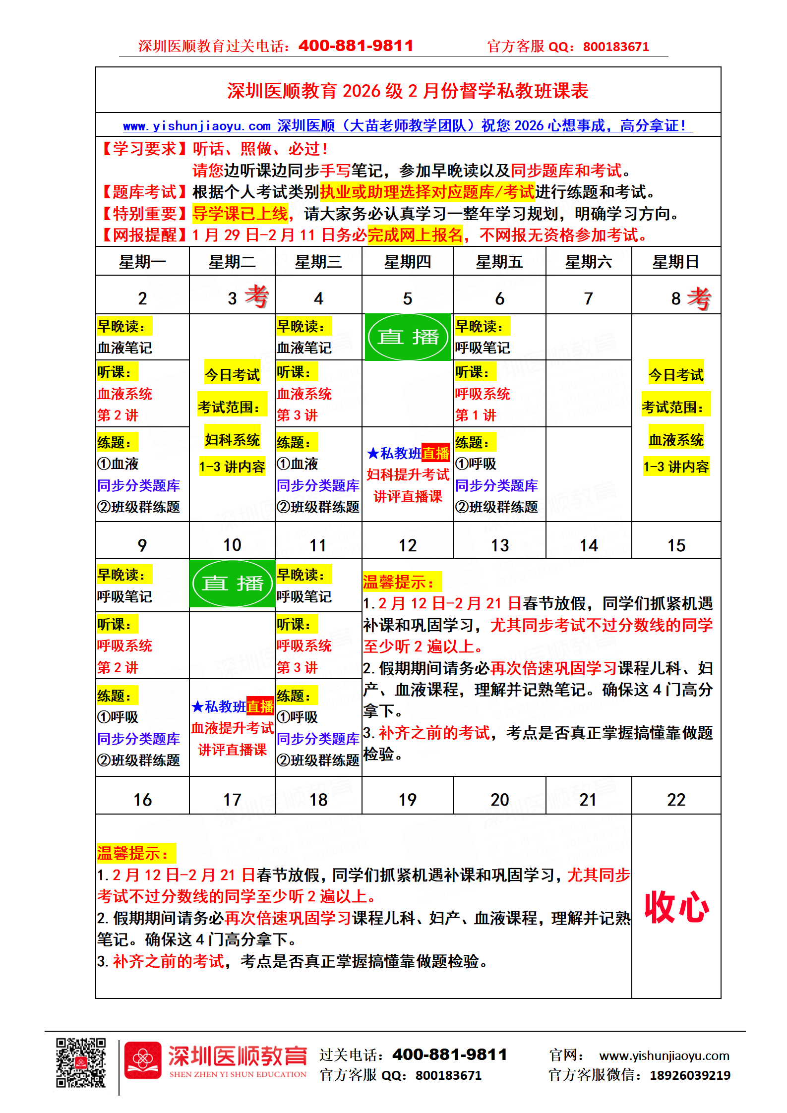 深圳医顺教育2026级2月份督学私教班课表